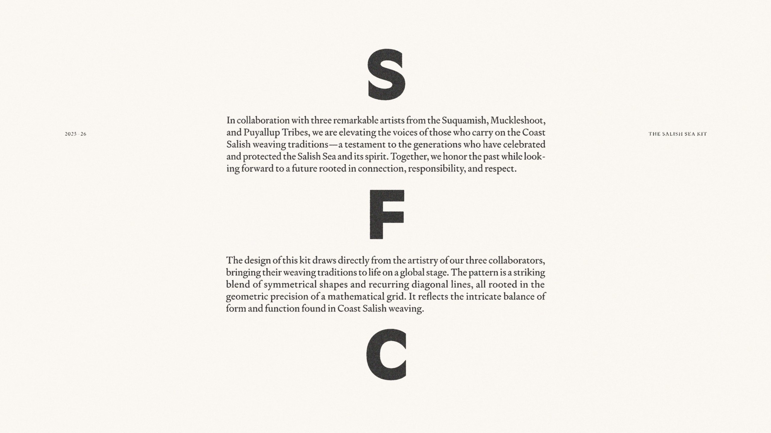 Project InfoColumn lead the creative direction, art direction, and campaign design for the Sounders FC Salish Sea Kit release. This jersey was a result of a meaningful collaboration with Connie McCloud, Gail White Eagle, and Danielle Morsette—three Coast Salish artists from the Puyallup, Muckleshoot, and Suquamish Tribes—and Adidas. Woven with meaning, this Community Kit celebrates the artistry of these three women and the enduring weaving traditions that connect generations. In addition to bringing the campaign to life, Column designed two signature details: the jock tag sign-off and the back neck emblem. This kit was ranked number 1 on ESPN’s MLS Jersey Power Rankings—the second consecutive year for the Sounders after their Anniversary Kit in 2024.